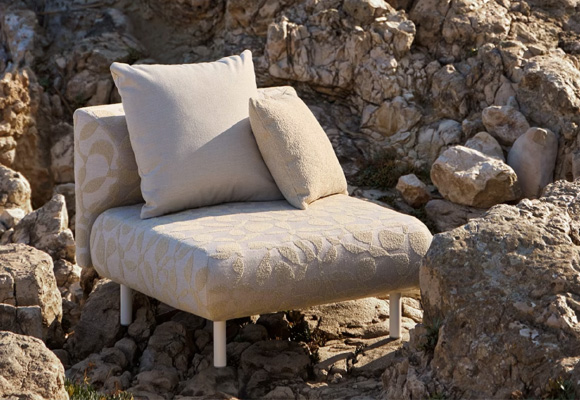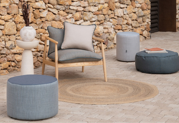 Agoraの特徴は100% Solution Dyed Acrylic(アクリル原着糸)製であるということ。強度が高く、堅牢度に優れ(日光による退色がありません)、漂白剤によるメンテナンスも可能なアウトドア向け最強の素材を、インドアでも満足できる高級感あるソフトなテクスチャーに織り上げました。