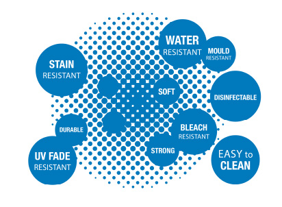 漂白剤も使用可能で、汚れを落とすと同時に除菌ができ、清潔にご利用いただけます。また、撥水、防汚、防カビ加工で汚れが付きにくく、お手入れが簡単です。ホテルやレストランといった商業施設や一般の住宅の他、ペットとの暮らしにもお勧めです。